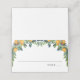 Cartes d'escorte avec branches de verdure avec clémentines orange. Écrivez les noms des invités et les numéros de table.