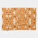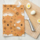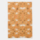 Orange fabric pattern with white sheep, sunflowers, mushrooms, and leaves. The design is shown in both horizontal and vertical orientations.