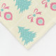 Eine Decke mit einer niedlich orangefarbenen Fuchsbild in einem schwarzen Oval. Er trägt eine rote Weihnachtsmannmütze und hat festlich grüne dekorative Akzente auf seinem Schwanz und auf der anderen Seite seiner Brust. Frohe Weihnachten ist auch im ovalen Rahmen geschrieben. Der Hintergrund ist das festliche Muster von Weihnachtsbäumen und Ornamenten auf cremefarbenem Hintergrund.