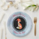 Papier-Teller mit einer niedlichen Orangenfox-Abbildung in einem schwarzen Kreis. Er trägt eine rote Weihnachtsmannmütze und hat festlich grüne dekorative Akzente auf seinem Schwanz und auf der anderen Seite seiner Brust. Frohe Weihnachten und Glück neues Jahr geschrieben am Rande des Tellers. Der Hintergrund ist Vintag und blau grau mit einem verblassten Punktmuster am oberen und unteren Ende.