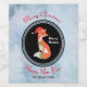 Ein Weinflaschenlabel mit einer niedlichen Orangenfox-Abbildung in einem schwarzen Oval. Er trägt eine rote Weihnachtsmannmütze und hat festlich grüne dekorative Akzente auf seinem Schwanz und auf der anderen Seite seiner Brust. Frohe Weihnachten und Glück im neuen Jahr geschrieben in kurvigem Text oben und unten. Der Hintergrund ist eine bedrückte, blau-graue Farbe mit einigen zufällig verblassten Punkten.