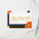 Elégante marguerite orange avec un arrière - plan marron et blanc avec une bande de preppy bleu et noir sophistiquée. Le script est dans une élégante couleur jaune or. La papeterie mariage de coordination est disponible à Rizziez Mariage Place.