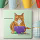 Eine niedliche Orangenkatze, die vor einer lila Tasse Kaffee sitzt, im Hintergrund von Grün