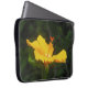 Das Originalfoto von MaeFlowers auf diesem 15" Laptop Sleeve ist mit einer hellgelben orangefarbenen Hibiskus-Blume in voller Blüte vor einem natürlichen dunkelgrünen Hintergrund versehen. Die Blütenblätter der Blume haben eine gekräuselte Kante, und die Stamen enden in fünf winzigen roten Sphären. Unter der Blume sieht man ein glänzendes grünes Blatt des Hibiskus. Lassen Sie den Tag mit diesem Foto der Blume, einem tropischen Garten Schönheit!