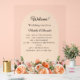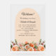 For an elegant and romantic wedding. A clear, transparent background decorated with orange, peach and pink florals. Arch shaped frame. Personalize and add your names and the program, timeline.