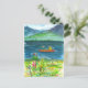 Eine Postkarte mit einer sommerlichen Szene aus dem Tahoer See mit zwei Personen in einem hellen orangefarbenen Kajak, der auf dem ruhigen blauen See schwebt, mit Wildblumen, die am Strand blühen und mit Tinte und Aquarell gezeichnet sind.