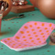 Rosa Hintergrundfarbe mit orangefarbenen Polka-Punkten Nahtlose Wiederholmuster-Design