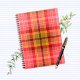 Orange and coral pink tartan design. Colors found within this tartan like pattern : orange, shades of pink, olive green, yellow, and deep burgundy.