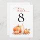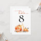 Terracotta Orange Pumpkins Candle Wedding Tischnummer. Der Tisch steht ganz oben in einem modernen Set-Skript. Das gleiche Design ist auf der anderen Seite.