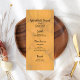 Das hübsche "Orange Pumpkins Wedding Menu" im Herbst mit den Details der Mahlzeit, die Sie in Ihrem gemütlichen rustikalen September, Oktober oder November Brautparty essen, Ehe Empfang Abendessen oder Post Hochzeit Brunch mit dem Salat oder ersten Gang, Vorspeise oder Zweitgang und Dessert oder dritter Gang. Dieses natürliche, eigens für den Herbst zubereitete Speisekarte bietet ein digital erweitertes Foto von Orangenkürbissen.