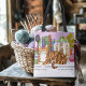 Orangefarbene Katze sitzt auf einem Tresen oben in der Küche. Die Katze hält es für lustig, dass du ihn vom Tresen will. Bücher, Kekse, Pflanze und Utensilien sind im lila Hintergrund rund um den Mantel auf der Theke.