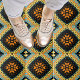 Lebhaftes dekoratives Fliesendesign mit geometrischen Formen in Orange, Gelb, Türkis und Schwarz.