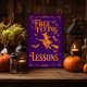 Ein tiefes lila Halloween-Party-Poster mit kostenlosen Flugstunden von einer glitzernden orangen Hexe auf einem Besen, umgeben von orangefarbenen Glitzer-Fledermäusen und Sternen.
