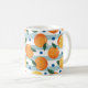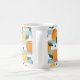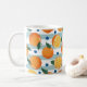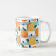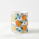 Orangen auf gestreiftem Hintergrund, Sommermuster. Kaffeetasse