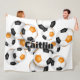 Dieser Fun-Fußball-Fleecedecke kann mit dem Namen des Athleten personalisiert werden, auf dem ein Haufen übergroßer orangefarbener, schwarz-weißer Fußballbälle von katz_d_zynes abgebildet ist