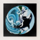 Ein Orca, der aus dem Ozean gesprungen ist, mit Wasser überall. Mund und blauer Himmel rund um den Killerwal gezeichnet in einem Art Nouveau Tattoo Stil.