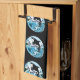 Ein Orca, der aus dem Ozean gesprungen ist, mit Wasser überall. Berge und blauer Himmel rund um den Killerwal gezeichnet alle in einem Art Nouveau Tattoo Stil.