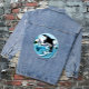 Ein Orca, der aus dem Ozean gesprungen ist, mit Wasser überall. Berge und blauer Himmel rund um den Killerwal gezeichnet in einem Art Nouveau Tattoo-Stil.