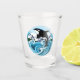 Ein Orca, der aus dem Ozean gesprungen ist, mit Wasser überall. Berge und blauer Himmel rund um den Killerwal gezeichnet alle in einem Art Nouveau Tattoo Stil.