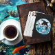 Ein Orca, der aus dem Ozean gesprungen ist, mit Wasser überall. Berge und blauer Himmel rund um den Killerwal gezeichnet alle in einem Art Nouveau Tattoo Stil.