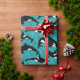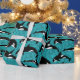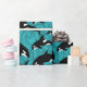 Fügen Sie den Geschenken eine aquatische Touch mit diesem illustrierten Packpapier hinzu, das Illustrationen von Orcas oder Killerwalen in Schwarz-Weiß-Set vor einem aquamarinen, blauen Meereswellen-Hintergrund zeigt.
