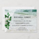 Eine romantische Probe Dinner Einladung mit orchitischen Blume auf einem Hochzeitsschleier mit einem Strand mit Spitzen und Perlen im Hintergrund. Schöne für eine Feier an der Küste.