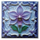 Eine orchide Blume mit weißen Blütenblättern und grünen Blätter, umgeben von einem Zierrahmen mit Blumenmotiven, auf einem viereckigen Kachel mit blauen und weißen Farbtönen.