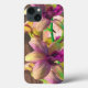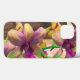 Die Orchideen blühen wieder im Garten, im Original Foto von ZoeSPEAK auf diesem iPhone 13 Case. Die Blume, die aus einem sich drehenden grünen Stamm hervorgehen, haben lila Zentren, die sich an den Blätterspitzen in Gelb vermischen. Der natürliche Holzboden Set den skulpturalen Formen und Farben.