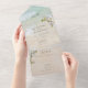 Plage à thème, tropical, tout-en-un faire-part de mariage avec carte de réponse détachable. Des orchidées blanches décorent l'espace invitation. Des initiales peuvent être ajoutées en haut, sous le rabat. L'image arrière - plan est le sable de plage avec des vagues qui descendent au bord de la mer au sommet des cartes. Trois modèles d'adresse sont à votre disposition à l'extérieur. Si une enveloppe extérieure est utilisée, supprimez le texte d'adresse inutile. Un cachet peut être ajouté à la carte de réponse afin que les clients puissent simplement remplir les noms et les informations de réponse et les déposer dans le courrier. La réponse au menu peut être changée en un simple "assistera" et "n'assistera pas". Bien que l'exemple de texte soit destiné à un mariage, le modèle de texte principal de l'invitation est sous forme de paragraphe et peut être facilement modifié pour un mariage ou un autre événement côtier. Le graphique extérieur est bleu-vert.