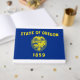 In diesem Design ist die Staatsflagge von Oregon zu sehen, das sich in der Pazifikregion Nordwesten an der Westküste der Vereinigten Staaten befindet. Der Staat grenzt an Idaho, Washington, Kalifornien und Nevada. Die Flagge Oregons hat einen marineblauen Hintergrund mit einem goldenen Siegel und einem goldenen Text; sie wurde erstmals im Februar 1925 offiziell verwendet. Die Fahne enthält die Worte "Staat von Oregon" und das Jahr 1859, als Oregon zum ersten Mal Staat wurde.