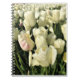 Wunderschöne weiße Tulpen auf einem Feld auf der Holzschuhfarm in Woodburn, Oregon. Die weißen Tulpen sind fast blendend, einige mit hellrosa Streifen. Foto wurde im April 2019 aufgenommen.