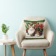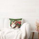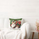 Un carré lance un oreiller avec une bordure verte présente une peinture aquarelle d'un chat tabby devant des poinsettias et des saints. Le chat a des rayures brune et brune, un coffre blanc et des yeux jaunes. Il est allongé sur une surface blanche, et l'arrière - plan est rempli de poinsettias rouges et de feuilles verts saints. La peinture a un effet doux et aquarelle, avec un ombrage doux et un mélange de couleurs.