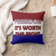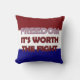 Freedom est un design graphique numérique. Le côté avant de ce coussin est habillé d'un texte cousu décoratif à la fois dans un plaid rouge blanc et bleu et une couleur rouge solide. Le texte dit : LIBERTÉ, ça vaut la peine d'être combattu. L'arrière - plan est rouge blanc et bleu rayures avec des bords cousus aussi. Le côté arrière du coussin est bleu foncé.