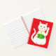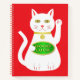 Dieses phantastische Notizbuch zeichnet sich durch ein grafisches Design-Bild einer glücklich orientalisch-weißen Katzenkatze aus. Die Katze hat schöne goldene Augen und trägt eine goldene Medaille auf dem Halsband. Die Katze hat rosa Ohren und Flüstern. Dieses niedliche kleine Kätzchen hält einen goldenen Jadestein mit grünem Jade und eine Nachricht in goldenem Text, die "Viel Glück" sagt.