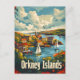 Eine faszinierende Vintage Darstellung der Orkney-Inseln, eines Archipels vor der Nordostküste Schottlands, bekannt für seine rauen Landschaften, seine antike Geschichte und sein maritimes Erbe. Das Design besticht durch die dramatischen Felsen, ruhige Strände und historische Stätten wie den Ring of Brodgar und Skara Brae, die alle in nostalgischem Stil gehalten sind. Dieses Kunstwerk erinnert an die zeitlose Schönheit und den kulturellen Reichtum der Orkney-Inseln und lädt die Besucher ein, ihren einzigartigen Charme und ihre geschichtliche Vergangenheit zu entdecken.