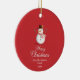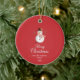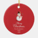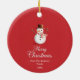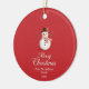Eine festliche Urlaubspostkarte mit einem bezaubernden Schneemann mit braunem Hut und gestreiftem Schal auf einem reichen roten Hintergrund. Personalisieren Sie mit Ihrem Familiennamen und Jahr für einen warmen und zeitlosen Weihnachtsgruß.