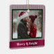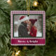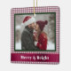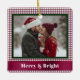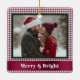 This festive Christmas photo ornament features your photo surrounded by a burgundy gingham background. It's crisscrossed with a burgundy ribbon, and the message "Merry & Bright" appears below in white. The photo is trimmed in dark green.