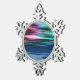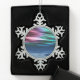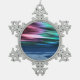 In der Bucht eines gefrorenen Landes schwimmt ein großer Eisberg im kalten blauen Meer. Schneeflocken und Sterne stören die Szene, und am Himmel leuchtet das Polarlicht in Rosa, Lavendel, Grün und Blau.