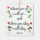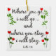 Personalized ornament with Scripture Verse on Marriage (Ruth 1:16) "Where you go, I will go...and where you stay, i will stay." Black text, with Red Heart Flowers. Cusomize the ornament with the couples' names and anniversary date on the back of the ornament.