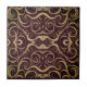 This ceramic tile features intricate vintage scrollwork patterns in gold against a rich burgundy background. The design includes swirling, symmetrical motifs inspired by classical decorative art, adding a luxurious and timeless feel to any space. Perfect for elegant interiors, accent walls, or traditional decor themes that require a touch of sophistication.