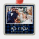 Ornement Carré Argenté Brush Script bleu Plaid Premier Noël M. Mme