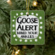 Un dessin typographique irrévérencieusement bizarre qui dit "Goose Alert, Mind Your Ankles". Il présente du texte noir et rouge sur un rectangle blanc avec des points blancs amusants et amusants qui l'entourent, le tout sur un arrière - plan gris.