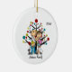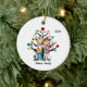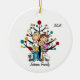 Un joli ornement en céramique amusant avec un couple en bâton, petit garçon, petite fille, un chien blanc de taille moyenne, chat gris, arbre de vacances. Customisé avec Johnson Family 2018.