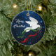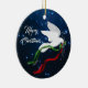 Personnalisez et égayez votre sapin de Noël avec ce magnifique ornement de Noël de la colombe blanche "One of a Kind" ! Il comprend une colombe blanche de Noël volant parmi les étoiles de Noël blanches portant une branche d'olivier avec des rubans rouges et verts, Souhaitant à tout le monde un ..."Joyeux Noël! Il s'agit d'une création artistique originale de l'artiste Kerry Miller.