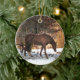 Cet ornement de vacances comporte un beau cheval brun d'or passant en revue pour les pommes tombées sous la neige, contre un contexte des collines nues. Ceci semblera beau pendre de votre arbre de Noël !