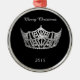 Ornement de Noël montré dans une forme ronde avec de l'argent et une couronne et un arrière - plan noirs de couleur. Montré avec le ruban rouge et l'argent bordés. Texte de Joyeux Noël dans le blanc. Customisez cet article avec votre nom, date ou autre personnelle de reconstitution historique.