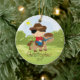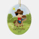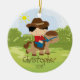 Personnalisez le petit ornement mignon daté de Noël de garçon de cavalier de horseback de cowboy de cheveux noirs réglé sur un arrière - plan d'herbe et d'arbre. L'ornement mignon de cheval comporte le petit garçon le plus doux montant son poney. Un cadeau de Noël de merveille sure à priser depuis de nombreuses années pour venir.