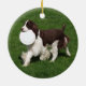 C'est un ornement de Noël rond, en céramique, avec une photo originale d'un régal, foie & blanc anglais Springer Spaniel courant avec une frizbee, avec un arrière - plan d'herbe verte.