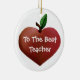 Ornement en céramique rond doux avec l'illustration graphique d'une pomme en forme de coeur, des deux côtés. Le texte lunatique blanc lit, au meilleur professeur, sur l'avant, et personnalisé, avec le nom de professeurs et le texte supplémentaire, sur le dos. Personnalisez le texte pour lire quelque chose que vous voulez. Grand ornement d'arbre de Noël que n'importe quel professeur appréciera.