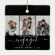 Commémorez votre fiançailles avec ce magnifique ornement de gardien moderne. Le texte blanc dit "Notre premier Noël engagé", avec le mot "engagé" dans un élégant script d'écriture manuscrite avec des fioritures avant et après. Remplacez les trois exemples d'images par vos photos verticales préférées, et ajoutez vos noms et l'année en blanc sur un arrière - plan noir.